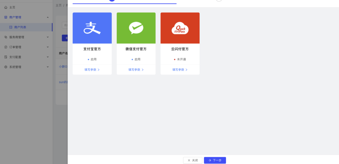 商户管理: 商户列表、新建商户、修改商户、删除商户、应用配置、 支付配置 、支付通道配置。