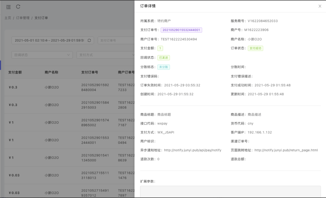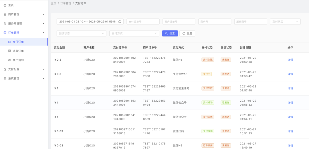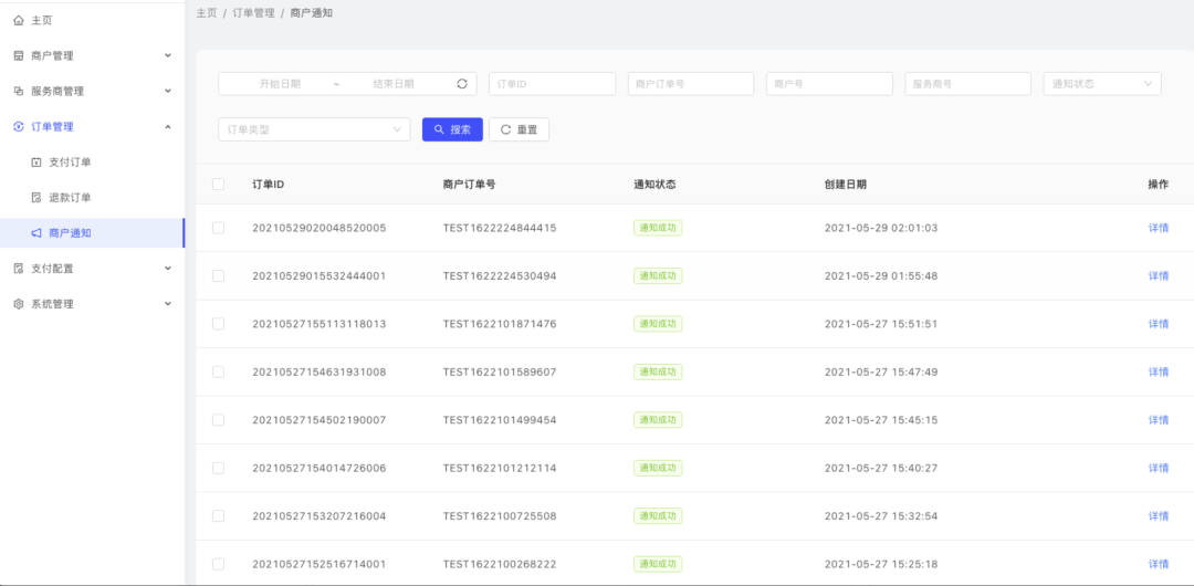 订单管理: 支付订单、退款订单、转账订单、商户通知。