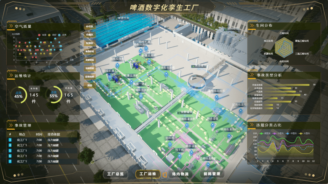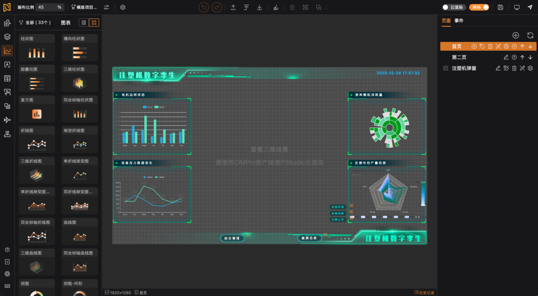 软件内置丰富的图表组件库(柱状图、饼图、折线图等),你可以直接在3D场景旁通过拖拽方式配置图表,并绑定后台数据,快速构建综合态势驾驶舱