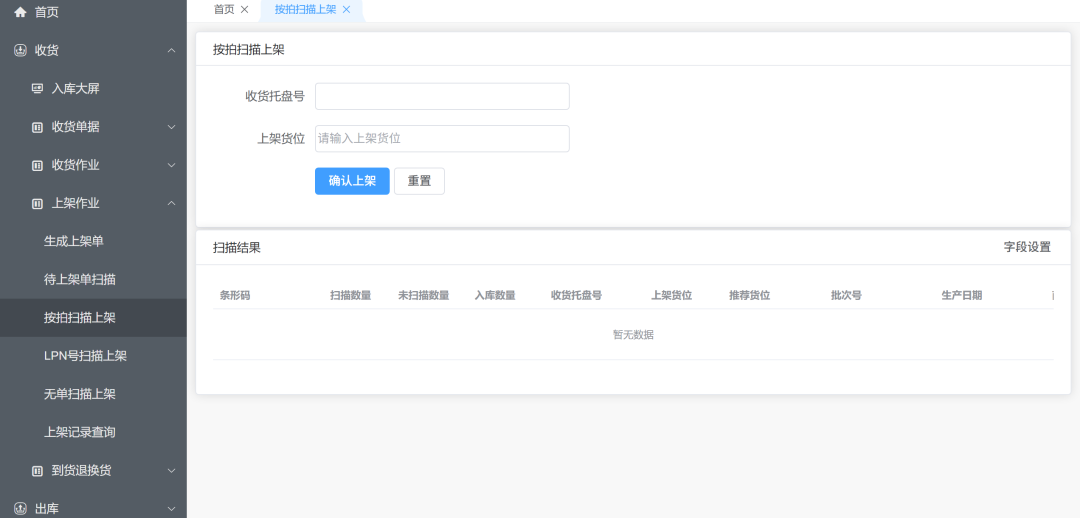收货区码盘、LPN 号扫描入库、无单扫描入库、入库记录查询
