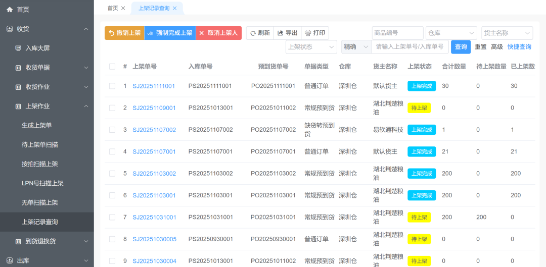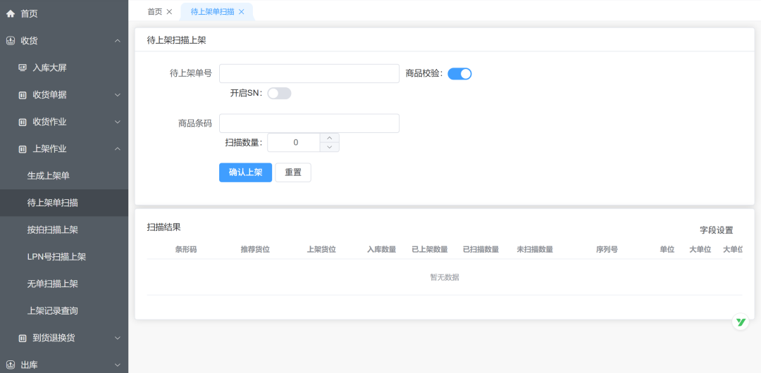 生成上架单、待上架单扫描、按拍扫描上架、LPN 号扫描上架、