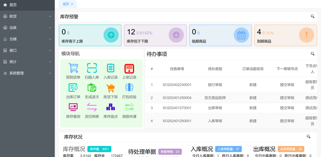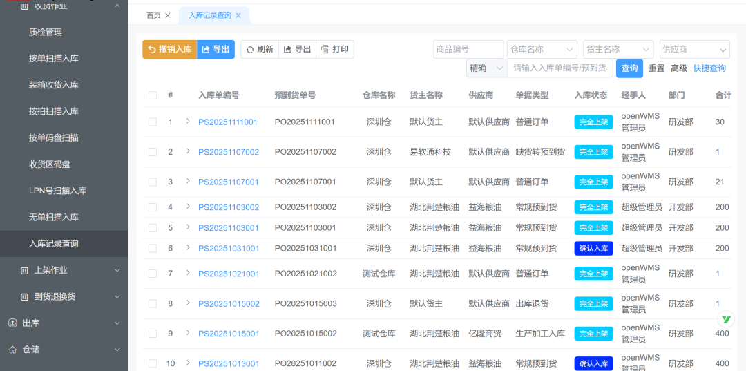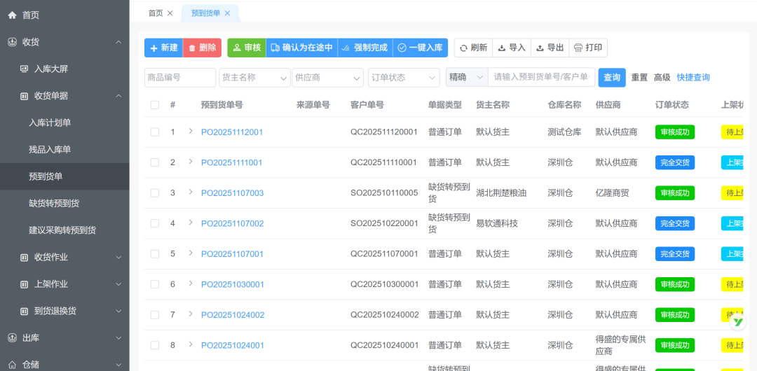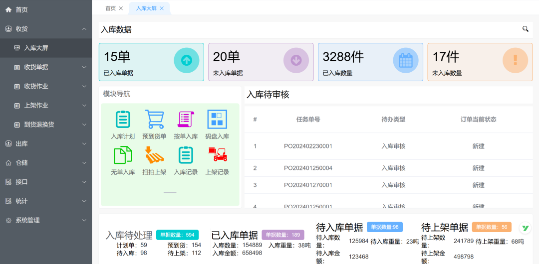 提供入库全流程数据可视化展示,实时呈现入库进度、单据状态、