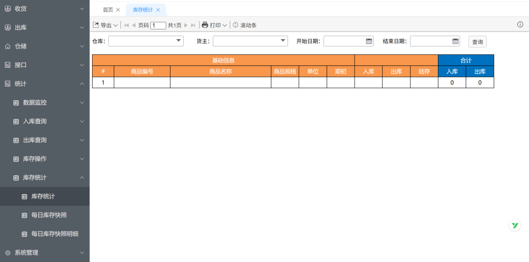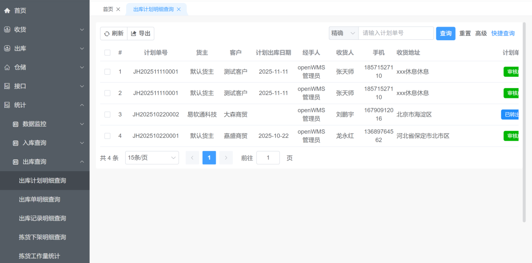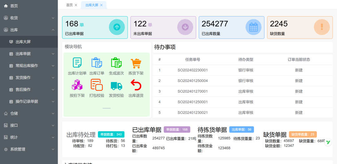 出库计划明细查询、出库单明细查询、出库记录明细查询、拣货下架明细查询、拣货工作量统计。