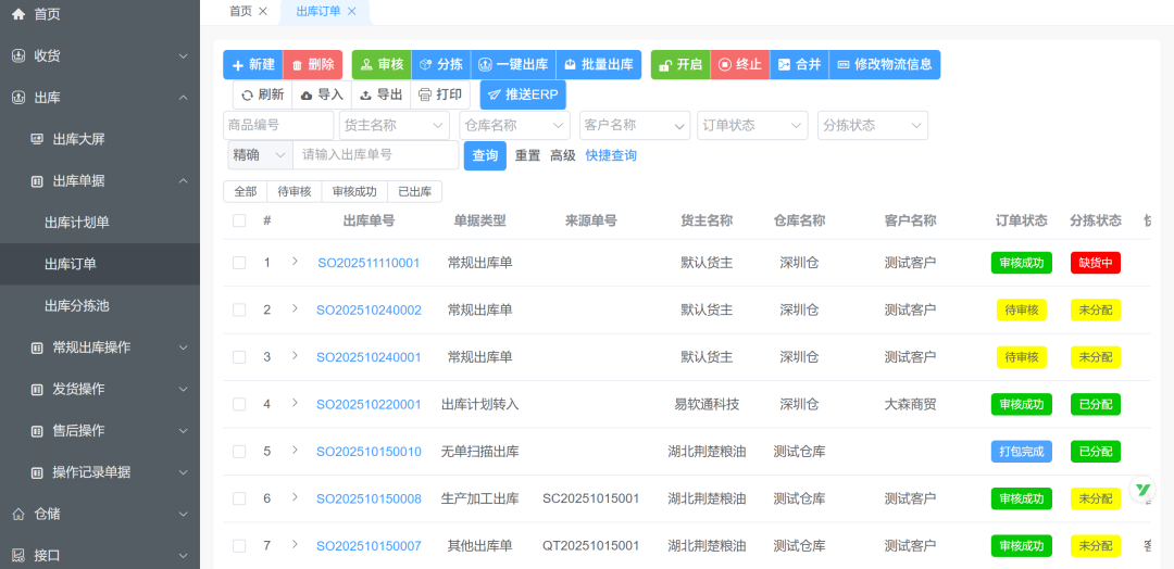生成波次、波次查询、出库拣货下架、出库按拍下架、出库下架回拣、