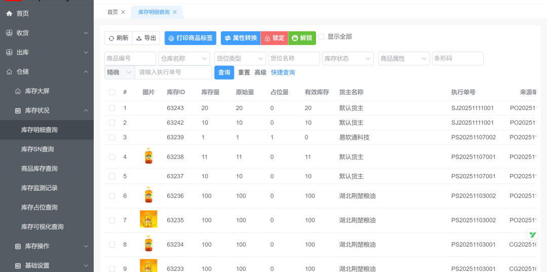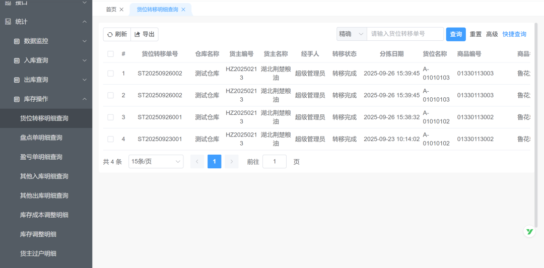 货位转移明细查询、盘点单明细查询、盈亏单明细查询、其他入库明细查询、其他出库明细查询、库存成本调整明细、库存调整明细、货主过户明细、效期信息明细、商品拆装入库明细、商品拆装出库明细。