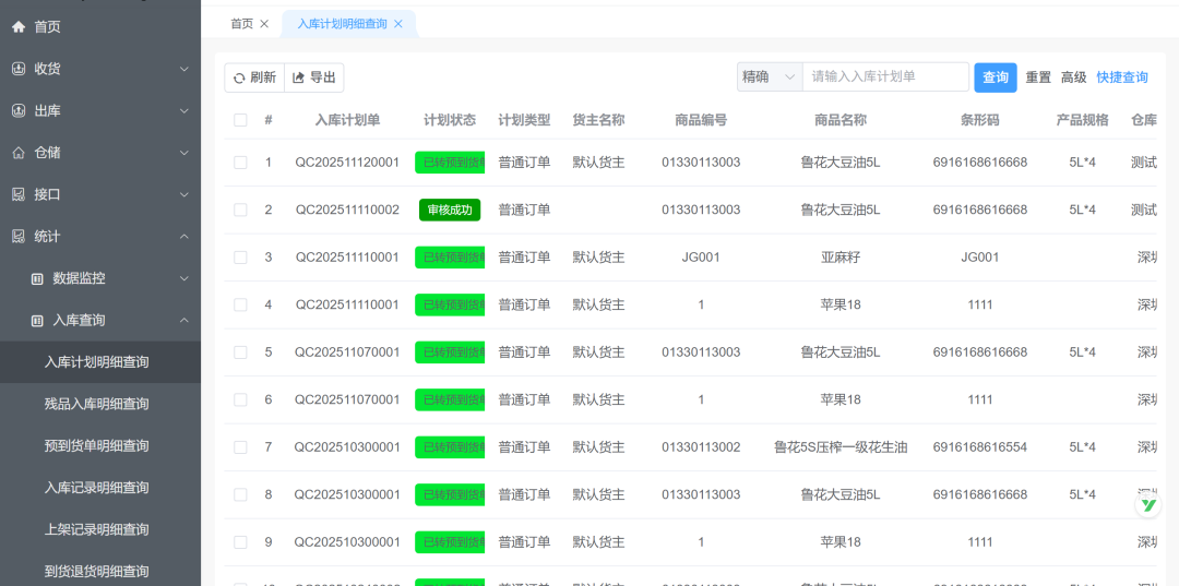 入库计划明细查询、残品入库明细查询、预到货单明细查询、