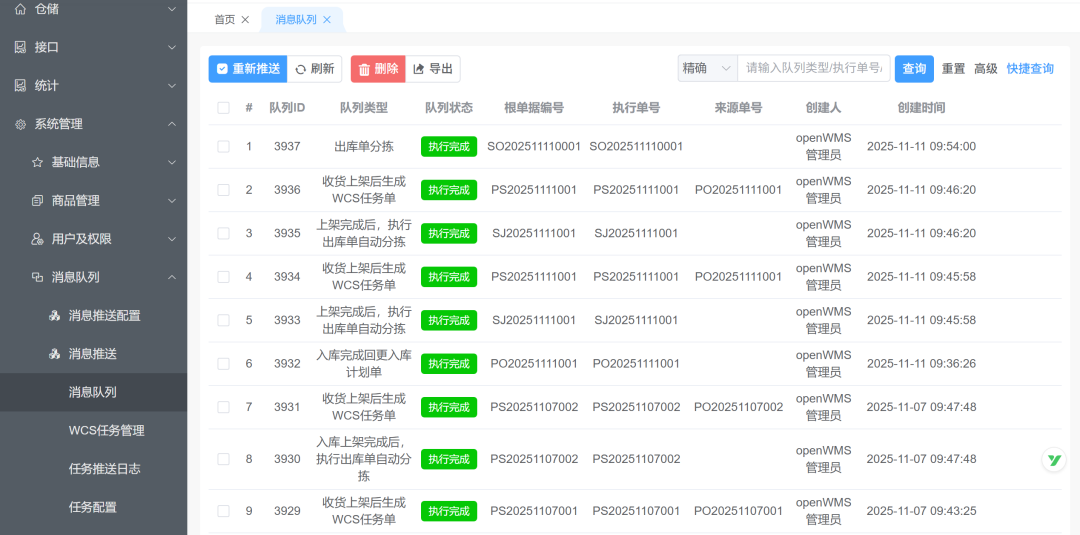 消息推送配置、消息推送(消息队列、WCS任务管理、任务推送日志、任务配置、任务推送)