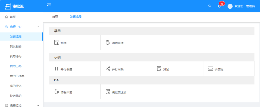 流程监控:进行中 / 已完结流程跟踪、超期任务提醒、催办信息管理;